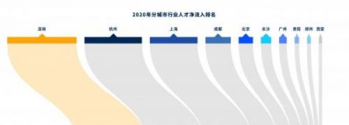 城市方面,深圳是2020年最具人才吸引力的城市,杭州、上海紧随其后。前十名中,长沙、贵阳、郑州、西安等多个中西部城市入选。